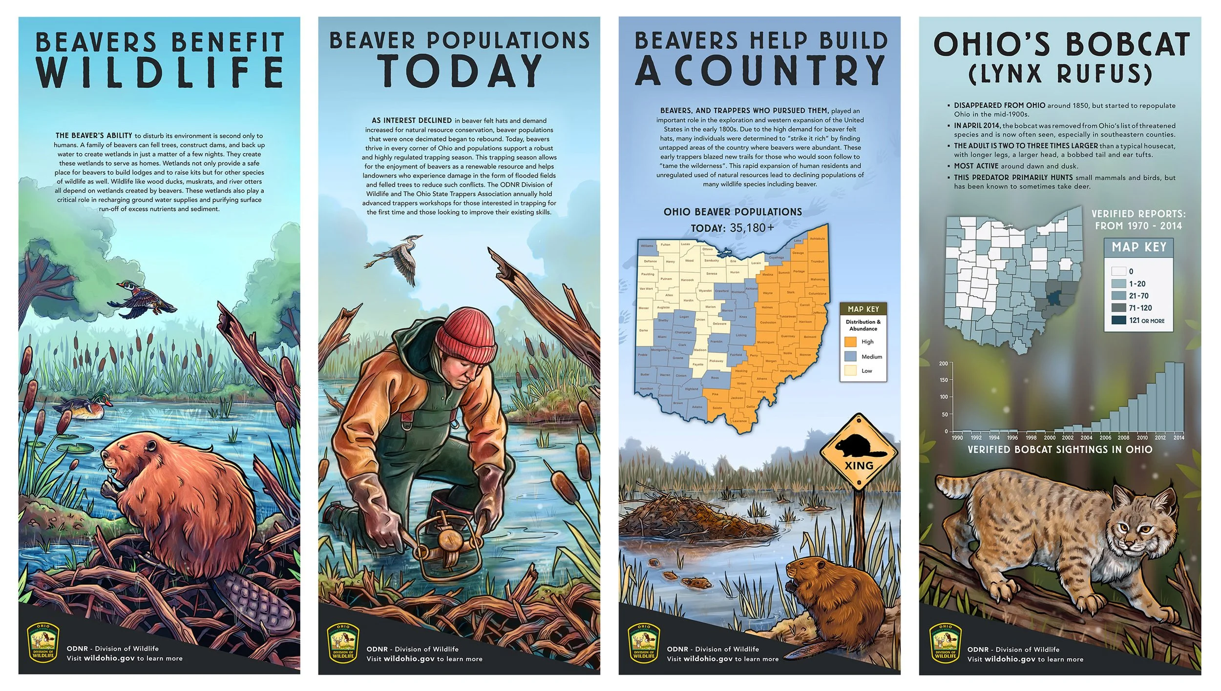 A set of educational posters on Ohio’s beaver and bobcat populations I created for the Canfield Fair. Digitally painted in Photoshop with text and map/chart graphics created in Illustrator.